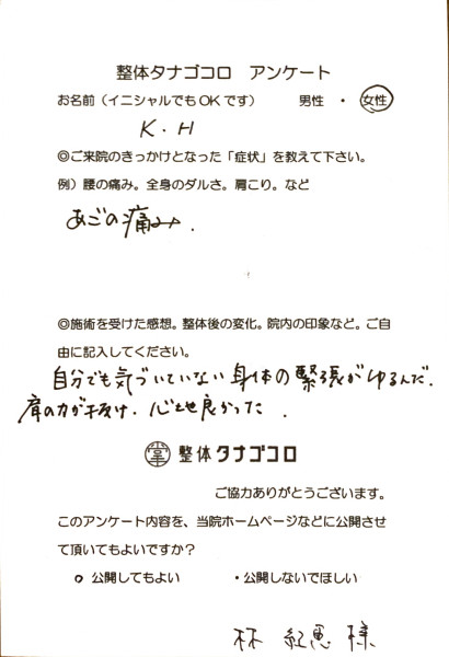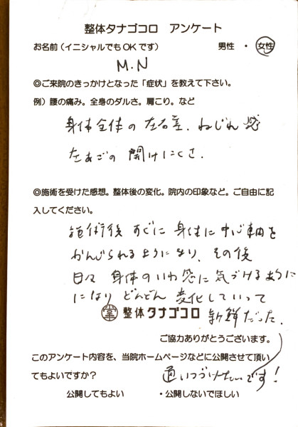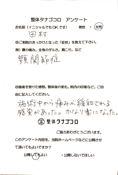 左側の片頭痛が定期的に発生することに悩んでいました。あと腰痛、肩こりなど・・・。とにかくたくさんの症状に悩んでいて何から手をつけていいのかわからない状態(泣)。しかも運動を定期的にして自分では体調管理できていると思っていたんです。整体タナゴコロさんにお世話になった良くしてもらったのは、顎関節、足の歪み、骨盤の歪みです。頭痛の原因・肩こりの原因→顎関節。腰痛の原因→足の歪みだなんて・・・あの時は想像がつきませんでした。整体タナゴコロさんはちゃんと私にもわかるような説明で症状の原因について一つずつ丁寧に教えてくれました。説明した通りに体が変わって行くので安心できます。私だけではなく今では家族全員お世話になっています。これからもよろしくお願いします。 (M,K様) ※効果には個人差があります |