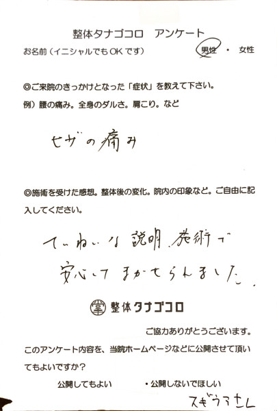 | 「痛みの原因や改善方法についてとても詳しく、教えて下さいます。」