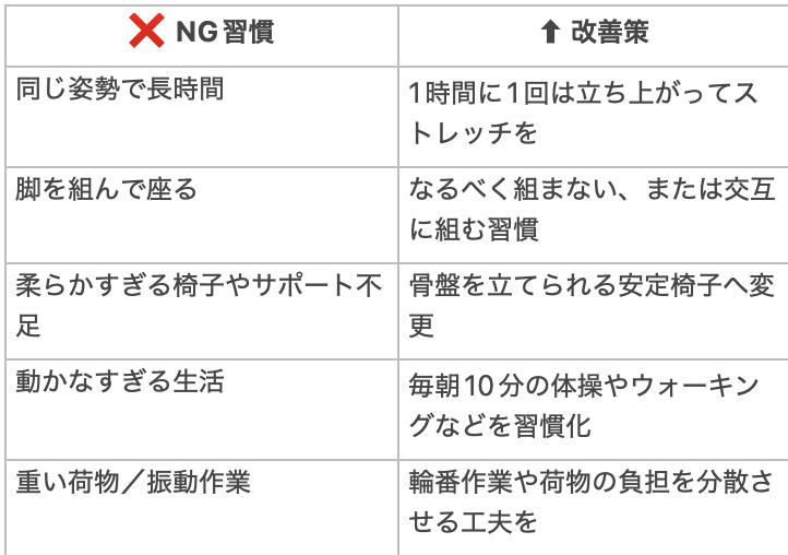 ぜひ今日から、1時間に一度のストレッチや、座り方の見直しを始めてみてください。少しの意識が、痛みの連鎖を断ち切る力になります。